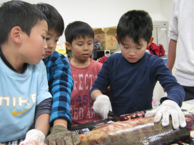 夕方は サケの解剖体験
