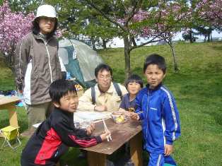 八重桜の下で、無事に総会終了なり