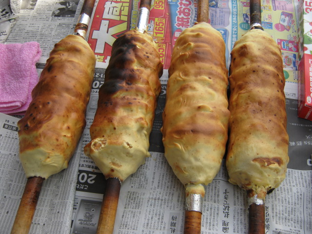 要は、棒の表面に生地のコーティングをつくっていく、って感じ。