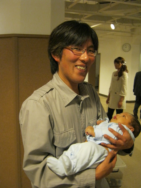 生後1ヶ月のプマル君を抱いて、大感激の赤石先生。